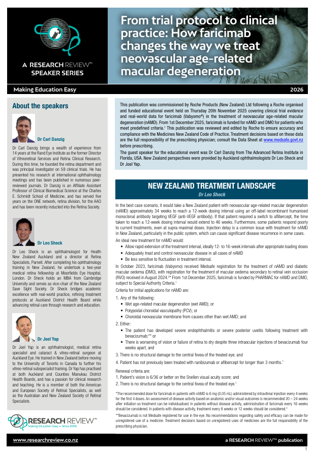 This publication was commissioned by Roche Products (New Zealand) Ltd following a Roche organised and funded educational event held on Thursday 20th November 2025 covering clinical trial evidence and real-world data for faricimab (Vabysmo®) in the treatment of neovascular age-related macular degeneration (nAMD). From 1st December 2025, faricimab is funded for nAMD and DMO for patients who meet predefined criteria. This publication was reviewed and edited by Roche to ensure accuracy and compliance with the Medicines New Zealand Code of Practice. Treatment decisions based on these data are the full responsibility of the prescribing physician; consult the Data Sheet at www.medsafe.govt.nz before prescribing.